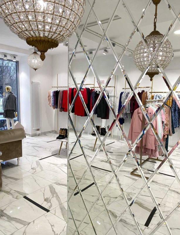 • Зеркальное панно в салоне, Москва, серебряная глянцевая плитка квадратной формы